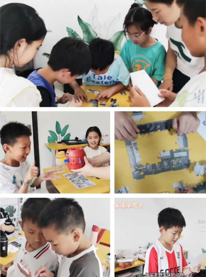 適合孩子們的“劇本殺”是什么樣的?今年暑托班期間,小朋友們在老師的主持下體驗了沉浸式劇本游戲《抓住那只兔子》。孩子們跟著兔子偵探留下的線索,一點點揭穿了動物王國偷偷買賣珍惜野生動物的鷹鷹老板!生動的劇情不僅帶大家了解保護野生動物的重要性,更讓他們明白要保護自己、遠離危險。劇情中的謎題游戲還鍛煉了觀察力、動手動腦能力、訓練了思維邏輯。