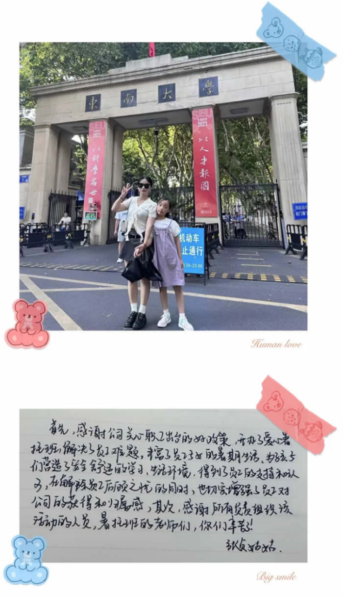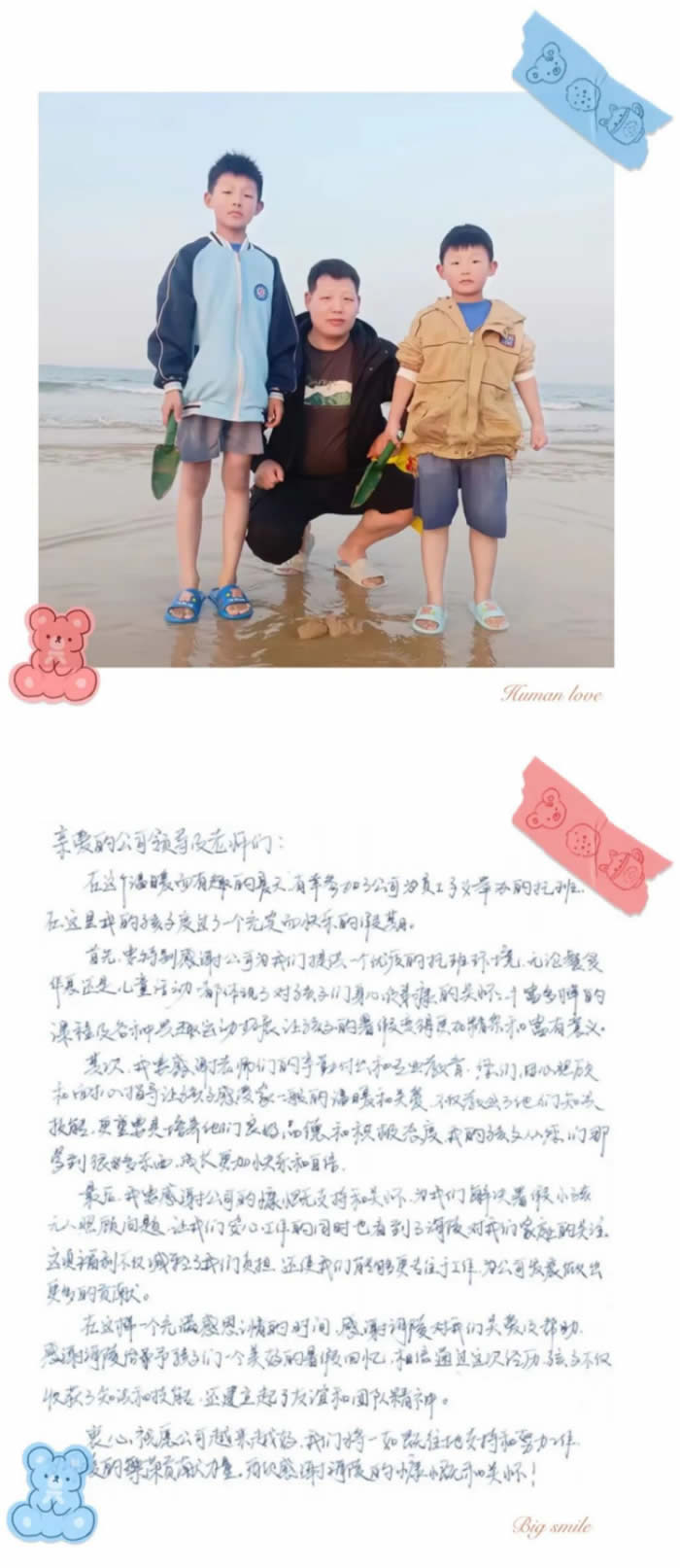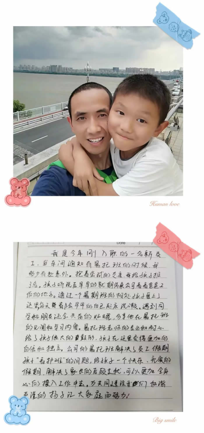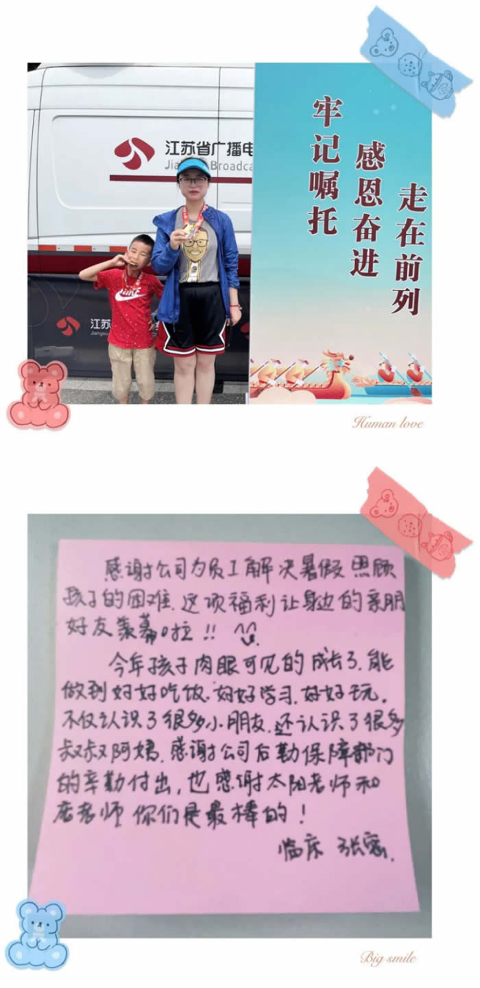 感謝公司為員工解決暑假照顧孩子的困難,這項福利讓身邊的親朋好友羨慕啦!今年孩子肉眼可見的成長了,能做到好好吃飯、好好學習、好好玩。不僅認識了很多小朋友,還認識了很多叔叔阿姨。感謝公司后勤保障部門的付出,也感謝太陽老師和龐老師,你們是最棒的!