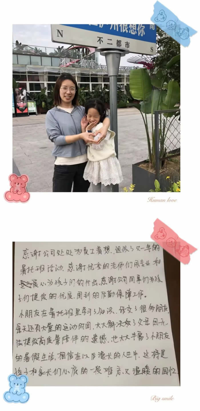 (片段)暑托班老師的專業和耐心給了孩子很大的鼓勵,孩子在這里變得更加自信和獨立。公司的暑托班解決了員工假期孩子“看護難”的問題,家長可以更加全身心地投入工作,為共同建設我們和諧嚴謹的揚子江大家庭而努力!